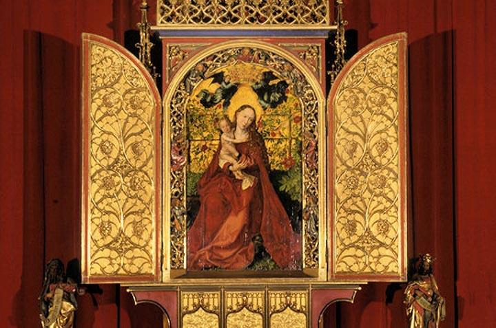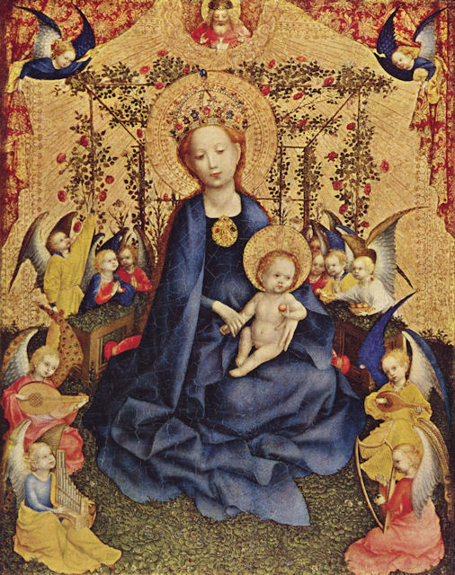 Een van de schilders die zich ook bezighield met het vervaardigen gravures is Martin Schongauer. Voor het klooster van Colmar schilderde hij de Madonna in de rozenhaag. Colmar is gelegen in de Elzas en was Franstalig. Het schilderij is in de 19e eeuw voorzien van een Romaanse boog, waardoor de vleugels van de engelen eruit zien als vleermuisvleugels. Maria is hier gekleed in een rood gewaad, als teken van liefde en lijden. Het doorgaans blauwe gewaad is een teken van trouw. Soms wordt dit ook gecombineerd: een blauwe mantel met daaronder een rood kleed.