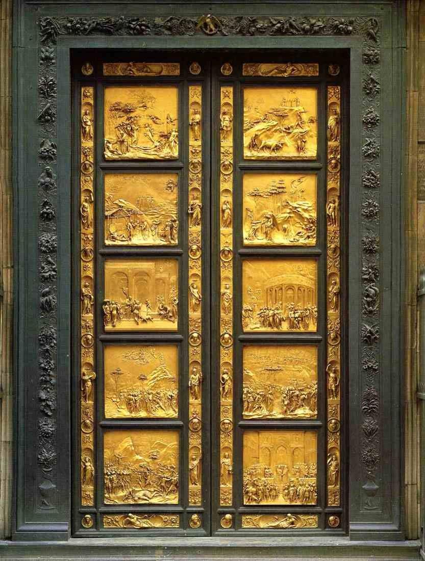 Voor de Dom van Florence staat het Baptisterium aan de oostkant ontwierp Lorenzo Ghiberti tien deurpanelen met afbeeldingen uit de Bijbel. Michelangelo noemde Ghiberti's deuren de Paradijsdeuren. De panelen tonen de grootsheid van de eigen tijd. De Oudheid werd gezien als een hoogtepunt in de kunst, daarna kwam een donkere periode waarin de kunst verviel en alleen vreemde uitingen voortbracht van Goten en later de Gotische bouwstijl. Met het aanbreken van de Nieuwe Tijden wordt de kunst van de Klassieke Oudheid herboren. De nieuwe kunst is groots en belangrijk net als in de Oudheid. Uit die Oudheid kende men de beeldhouwwerken en de bouw van tempels en gebouwen als het Colosseum. Van de schilderkunst is weinig overgeleverd.