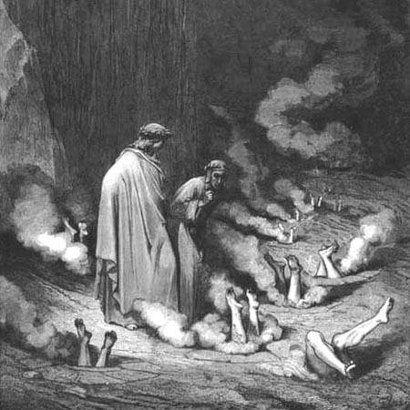 Dante vergelijkt de holten waarin de zielen staan met het doopvont uit het Baptisterium van Florence en vertelt dat hij ooit dat doopvont heeft moeten beschadigen om een kind van de verdrinkingsdood te redden. Dante vraagt Vergilius wie degene is die het meest te lijden heeft van de rode brandende vlammen rond zijn voetzolen. Vergilius brengt draagt Dante naar de bodem van de gracht, waar Dante de gestrafte ziel aanspreekt. Hier gebruikt Dante een vergelijking die voor zijn lezers een duidelijk referentiekader bevatten; hij vergelijkt zichzelf met een monnik die een huurmoordenaar de biecht afneemt terwijl deze in een kuil staat om levend te worden begraven. Dit was de geijkte straf voor huurmoordenaars. Zij werden veroordeeld tot een langzame martelende verstikkingsdood. De rechtspraak, onder invloed van de kerkelijke leer, hield er sadistische en agressieve manieren op na om te straffen. Alles in het kader van het hogere.
