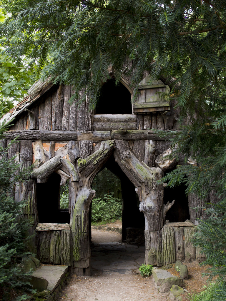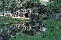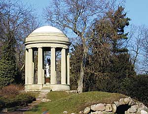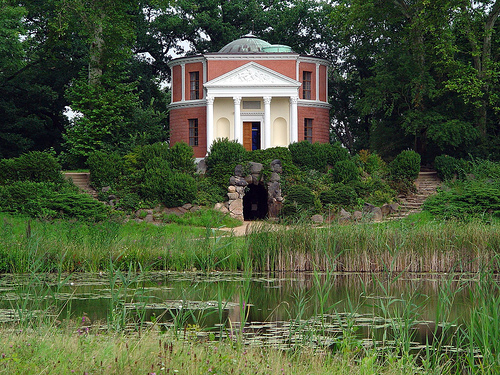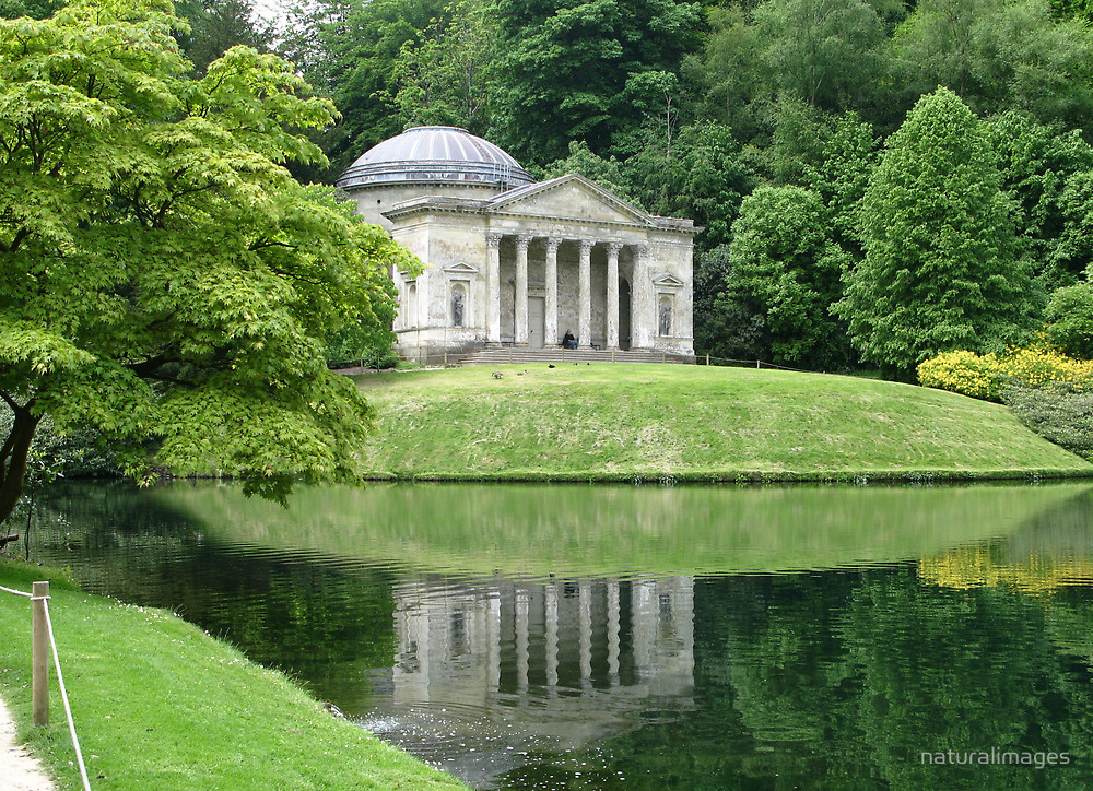 De ideeën voor de follies en ook de aanleg van rotspartijen werden beïnvloed door landschapsschilders, waaronder Claude Lorrain. Dit is een Pantheon tempeltje, dat een kopie is van het schilderij van Lorrain uit 1672: Aneas op Delos.