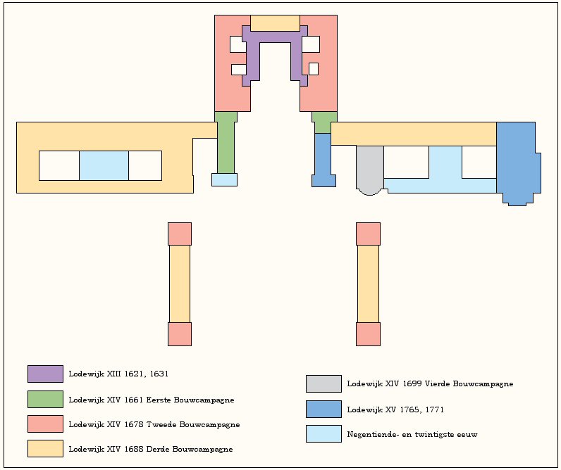 Het oorspronkelijke jachtslot van Versailles is gebouwd door Lodewijk XIII, de vader van de Zonnekoning, Lodewijk XIV. Lodewijk XIV was erg gesteld op Versailles en verhuisde van het Louvre naar het verbouwde jachtslot, als de nieuwe residentie van het Franse hof. Er is altijd aan het paleis van Versailles gebouwd en verbouwd. Er is geen algemeen concept. De bouwmeesters waren Louis le Vau, Jules Hardoin Mansart en Charles le Brun (tuinarchitect).
