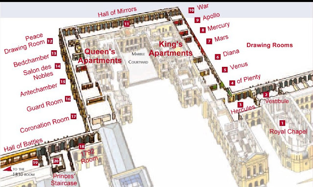 De meest bekende ruimte van het kasteel van Versailles in ongetwijfeld de Galleries des Glaces - de Spiegelzaal. Deze ruimte werd gebruikt voor ontvangsten, maar diende eigenlijk meer als wandelgang. Vanuit de Salon de Guerre is de linkerkant tegenover de vensters gedecoreerd met spiegels. De vensters aan de rechterkant kijken uit op de tuin van het kasteel.