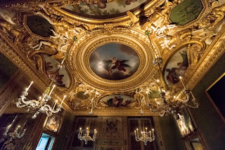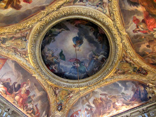 In het midden van het plafond een tondo met daarop het symbool voor Frankrijk Marianne met op haar schild een afbeelding van Lodewijk XIV.