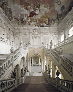 Het bijzondere aan het trappenhuis van slot Weissenstein is, dat het in het midden is gebouwd en de trappen langs de randen omhoog lopen. Hierdoor wordt de ruimte zeer harmonieus ingericht.