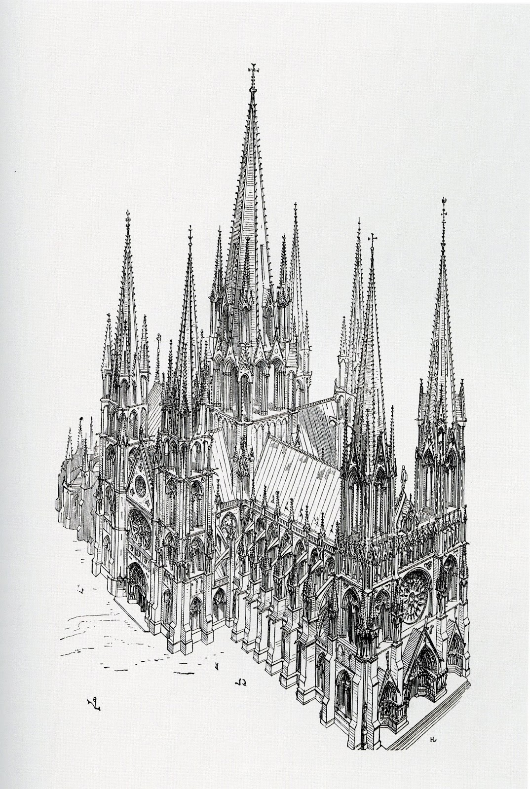 Viollet-le-Duc heeft verschillende boeken geschreven over Romaanse en Gotische architectuur. Zijn ideale gotisch kathedraal had maar liefst zeven torens: 2 aan west- noord en zuidzijde en een enorme toren op de kruising van middenschip en transept.