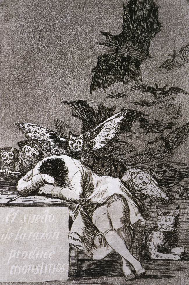 Los Caprichos, waarin hij de dwaasheden van Spaanse gemeenschap hekelde. De afbeeldingen waren vooral cryptisch vormgegeven. In een van de tekeningen richt hij zich op de overheersende invloed van de ratio. Het personage op de voorgrond is de personificatie van de ratio. Achter en naast hem vliegen allerlei gedrochten, uilen en vleermuizen rond. Volgens Goya, die allerlei gruwelen had meegemaakt in Spanje tijdens de Napoleontische bezetting, kwamen er allerlei oncontroleerbare driften en emoties vrij, als de rede in slaap is gevallen.