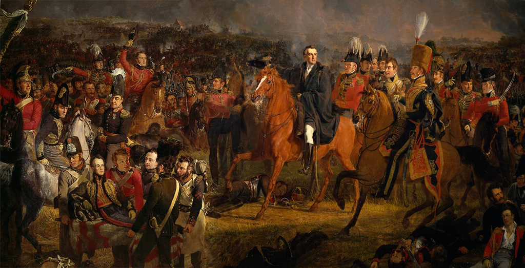 De Slag bij Waterloo van Jan Willem Pieneman. Het is een van de grootste schilderijen in het Rijksmuseum en gemaakt voor de hertog van Wellington (de figuur te paard in het midden). Wellington is met zijn leger in het defensief gedrongen, Napoleon lijkt de slag te gaan winnen, maar links komt de voorhoede van het Pruisische leger Wellington mededelen dat Blücher met zijn troepen in aantocht is. Op de voorgrond links ligt de kroonprins van Oranje, de later koning Willem II, die in de slag gewond is geraakt. Het werk was bedoeld voor de hertog van Wellington, maar koning Willem I kocht het schilderij voor zijn zoon en liet het meteen in het Rijksmuseum tentoonstellen. Het schilderij beeldt de Slag bij Waterloo uit in verhaalvorm.