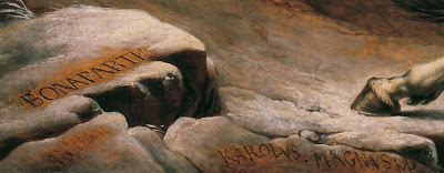 David versterkte de verering voor Napoleon nog eens extra door in de hoek links onder de namen in de rotsen te 'beitelen' van Napoleon en zijn grote voorgangers die ook over de Alpen trokken: Hannibal en Karel de Grote. Ook dit is een uiting van de Neo-classicistische stijl.
