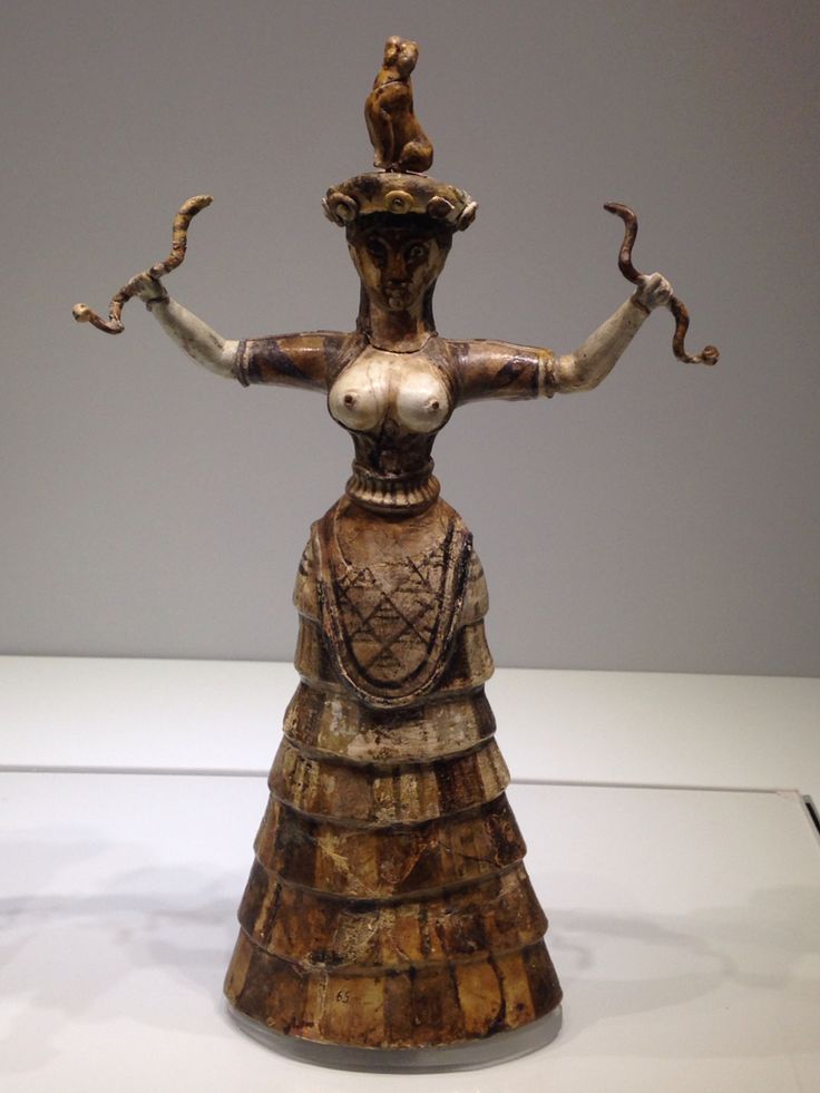 Oppassen voor interpretatie vanuit onze 21e visie. Er kan verschil zijn in betekenis van gebaren van 3000 jaar geleden. Bekijk vondsten in hun context: tijd en plaats.Kreta kende geen eigen grondstoffen als goud en ivoor. Deze werden ingevoerd o.a. vanuit Egypte. Veel keramieken beeldjes van “slangengodinnen” – vrouwenfiguurtjes met slangetjes in hun handen. Ongeveer 15 cm hoog. Mogelijk afgodsbeeldjes – een aardgodin. Ook deze gevonden in de natuur buiten het paleiscomplex. De beeldjes zijn gemaakt om frontaal te bekijken: smalle taille, brede heupen en blote borsten of doorzichtige kleding die de borsten tonen.