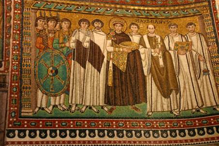 Belisarius. De figuur van de keizer komt in dit mozaïek duidelijk naar voren,
