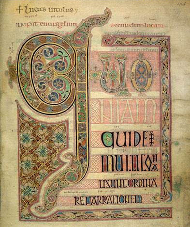 De monniken die als schrijver in een klooster werkzaam zijn proberen zich figuratieve vormen eigen te maken. De hoofdletters en de kruizen die ze tekenen zijn als juwelen, maar wel tweedimensionaal. In het Lindisfarne Gospels zijn tekening opgenomen van de Evangelisten met hun symbolen.