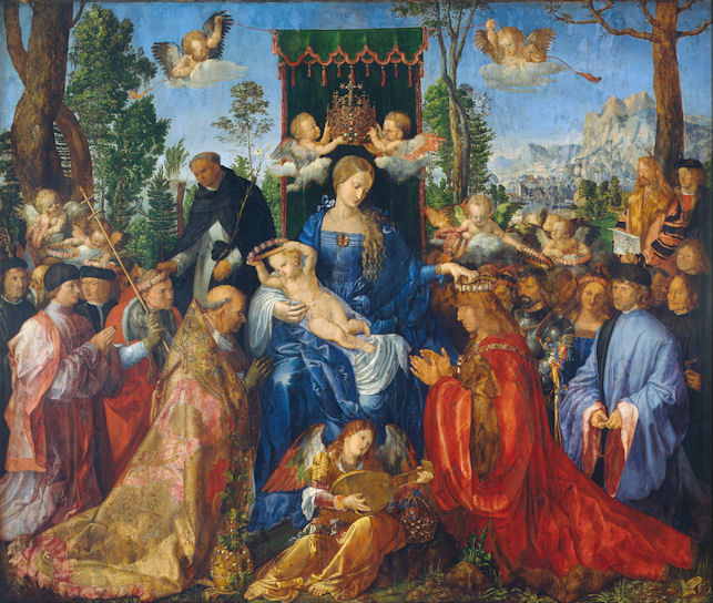 In Dürer's Madonna met de Rozenkrans zien we het gebruik van heldere kleuren, dat Dürer heeft overgenomen van de Venetiaanse kleurenexperts. Dürer schilderde het werk in opdracht van de familie Fugger voor de Duitse kapel in Venetië. We zien hoe Maria door engelen wordt gekroond en op haar beurt Keizer Maximiliaan I een rozenkrans op het hoofd zet. Aan de andere kant zit Paus Julius II. Achter de paus staat Dominicus Guzman de stichter van de Orde der Dominicanen die met het rozenkransgebed wordt geassocieerd.