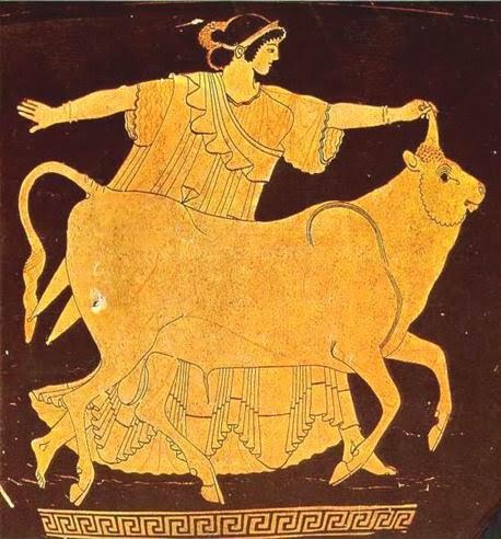In de Griekse mythologie spelen goden en godinnen een prominente rol. Belangrijkste god is Zeus die getrouwd is met Hera. Zeus neemt regelmatig andere gedaanten aan om jonge maagden te verleiden. Op een dag ontmoette hij in de gedaante van een stier de mooie Europa. In haar onschuld klom ze op zijn rug en Zeus ontvoerde haar naar Kreta, waar hij o.a. een zoon Minos bij haar verwekte. Minos werd koning van Kreta en werd een legendarische figuur in de Griekse legenden.