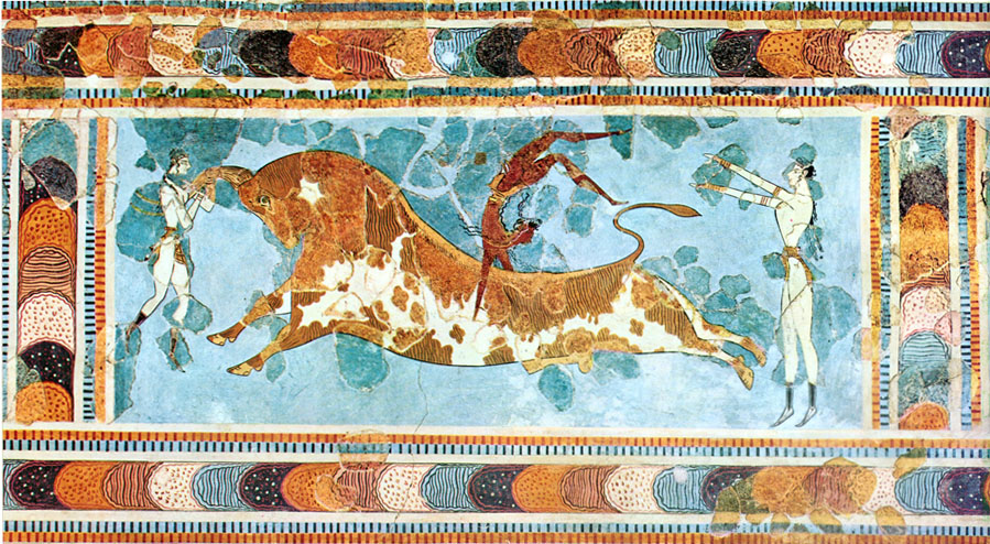 de godin en de stier. Het ritueel van het stierspringen is gevonden op vazen en