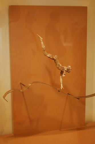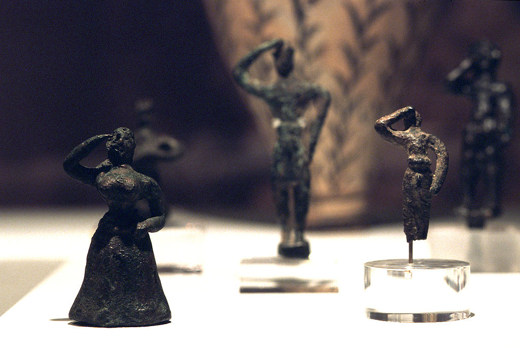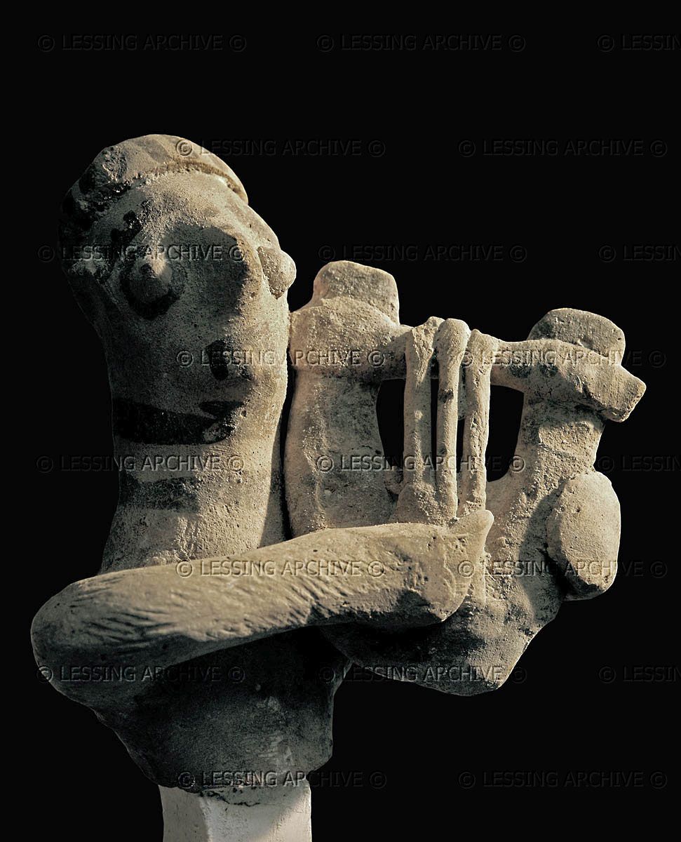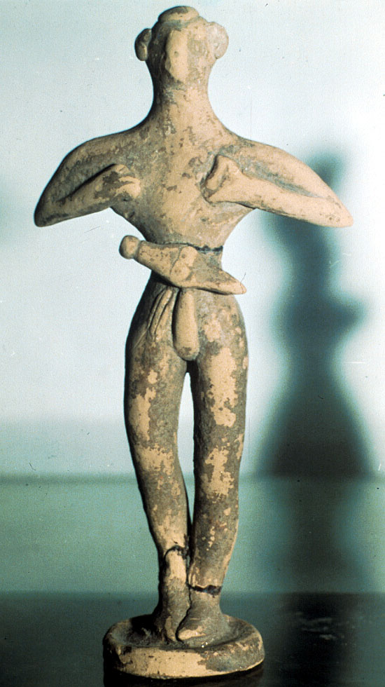 In de beeldhouwkunst vinden we beeldjes van klei en van brons. Kenmerkend is de smalle taille met riem en breed bovenlichaam.