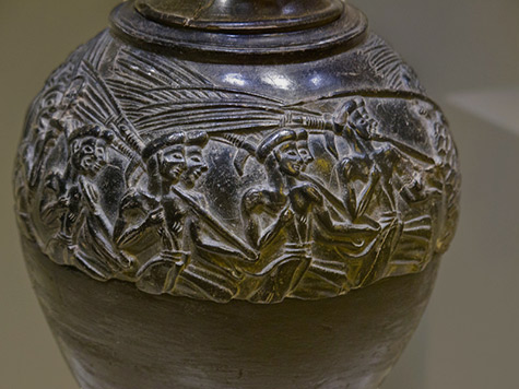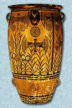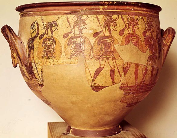 Dit soort kraters waren niet geschikt voor opslag van goederen, maar voor direct gebruik in het dagelijks leven. Op de kruik staan waarschijnlijk soldaten in een Myceense wapenuitrusting afgebeeld.