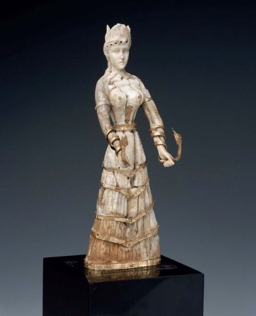 Oppassen voor interpretatie vanuit onze 21e visie. Er kan verschil zijn in betekenis van gebaren van 3000 jaar geleden. Bekijk vondsten in hun context: tijd en plaats.Kreta kende geen eigen grondstoffen als goud en ivoor. Deze werden ingevoerd o.a. vanuit Egypte. Veel keramieken beeldjes van “slangengodinnen” – vrouwenfiguurtjes met slangetjes in hun handen. Ongeveer 15 cm hoog. Mogelijk afgodsbeeldjes – een aardgodin. Ook deze gevonden in de natuur buiten het paleiscomplex. De beeldjes zijn gemaakt om frontaal te bekijken: smalle taille, brede heupen en blote borsten of doorzichtige kleding die de borsten tonen.