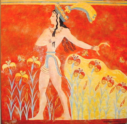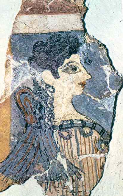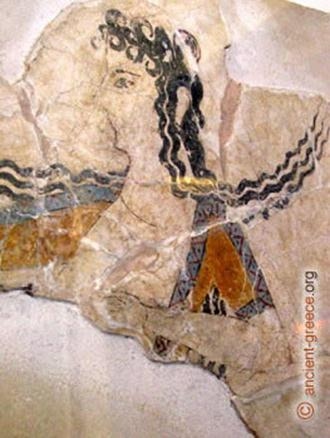 Belangrijk kenmerk van de Minoïsche cultuur zijn de lange vlechtjes als haardracht met op het voorhoofd kleine zwarte krulletjes.