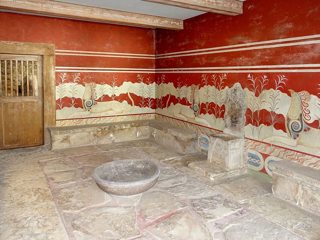 De "troon van koning Minos" heeft een zetel die ergonomisch gevormd is. De troon is van albast en dateert van 1200 v.Chr. Het is niet bekend of dit echt door de Minoïers is gemaakt. Rond 1400 v.Chr. komen ook de Myceners naar Kreta. Mogelijk hebben zij deze troon gebouwd. Op de muur naast de troon staan mythologische figuren: griffioenen.