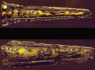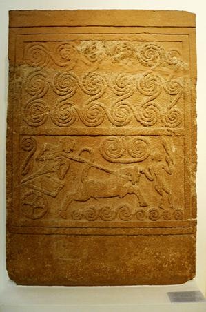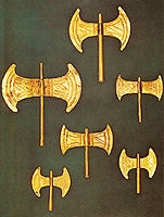 Labrys – dubbele bijl in keramiek en in reliëf op vloeren. Echte bijlen zijn niet gevonden, wel zijn er dubbele bijlen gevonden als sierspelden.
