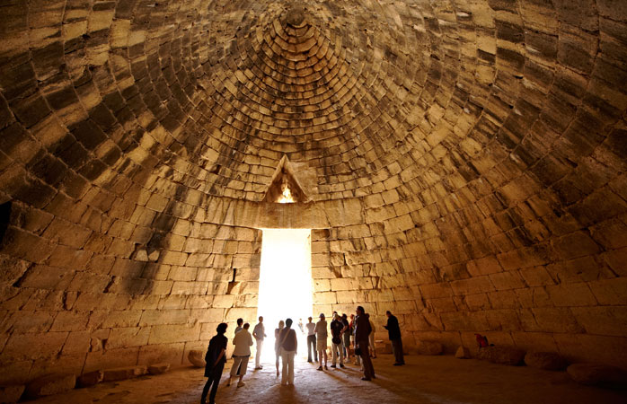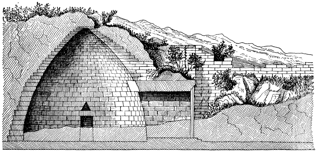 THOLOS – koepelvormig bouwsel van stenen, overdekt met een aarden heuvel. De toegangsweg was niet overdekt. Deze grafheuvel is onbeschadigd gevonden.