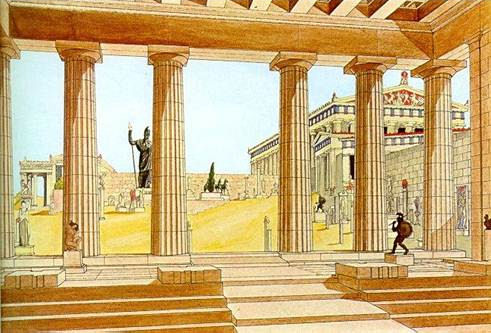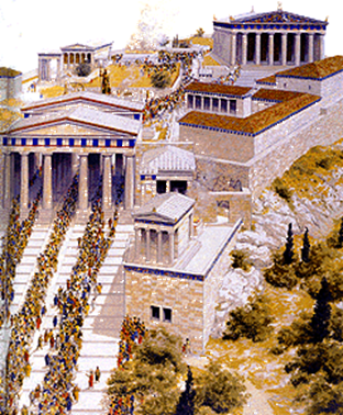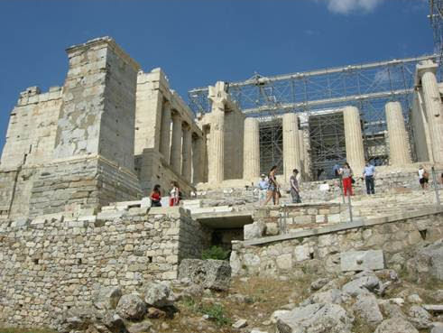 Het grote beeld – middenvoor achter de toegang. was gepolychromeerd. De Acropolis was voor de Atheners de uiting van macht. Griekenland was in de 5e eeuw geen eenheid, maar verdeeld in stadsstaten die onderling vetes hadden. Nog altijd zijn Grieken sterk streek en stadsgebonden: men is geen Griek, maar Athener of uit Thessaloniki.