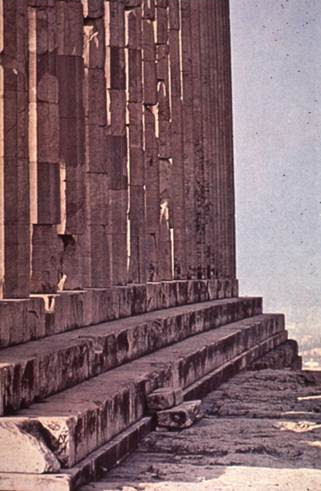 De zuilen van het Parthenon werden naar de hoeken toe boller gemaakt. Het oog trekt dit recht. Ook staan alle zuilen een tikkeltje krom. Ook dit wordt door het oog gecorrigeerd.