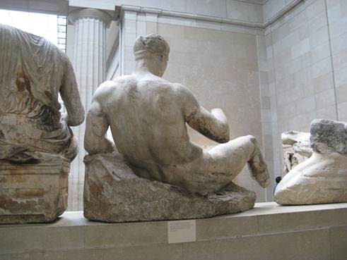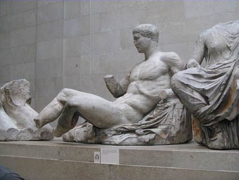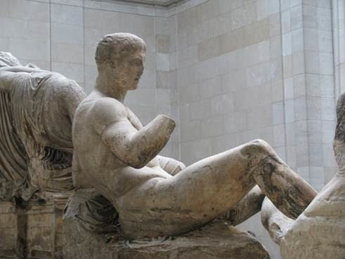 Een van de beelden in het British Museum is de zogenaamde Dionysos (Herakles?) waarschijnlijk gemaakt door Phidias. Het beeld is een deel van het oostelijk fronton en dateert van 438-432 v. Het beeld stelt een mannelijk naakt voor en heeft een grote plasticiteit. De armen van het beeld zijn los van het lichaam gebeeldhouwd en op het marmer worden schaduwen aangegeven voor een betere licht en donkerwerking, wat de dynamiek en uitstraling van het beeld verhoogt.