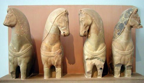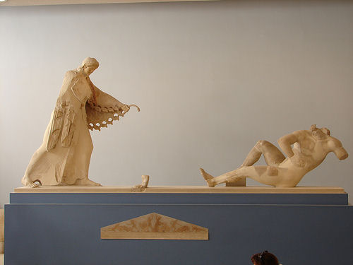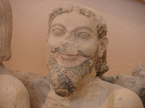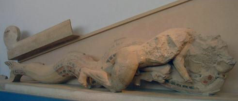 van Athene. De beelden zijn duidelijk gemaakt in de archaïsche periode. Het is een deel van het pediment en laat Herakles zien die tegen de Triton vecht. Het beeld is van 580-570 v. Chr.