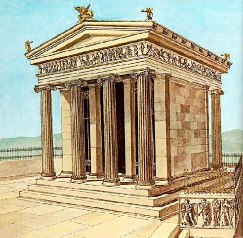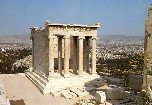 Op het plateau van de Acropolis bevindt zich rechts van de Propyleeën de Nikè-tempel. Waarschijnlijk de ontwerper Kallicrates. Het tempeltje is gebouwd tussen 430-420 v.Chr. Nikè betekent overwinning. De Nikè godinnen zijn de godinnen van de overwinning. Het bijzondere aan deze tempel is dat het alleen een naos en een pronaos omvat, alleen aan de voor- en achterkant een zuilengalerij en geen zuilengalerij langs de zijwanden. Deze vorm van tempelbouw wordt de amphiprostilos (engels: amphiprostyle = aan beide zijden) genoemd. Dit is een bouwstijl met vrijstaande zuilen (max. 4) aan de voorzijde van het gebouw, zodat een overdekt portiek of toegangspoort ontstaat en vier vrijstaande zuilen aan de achterzijde.