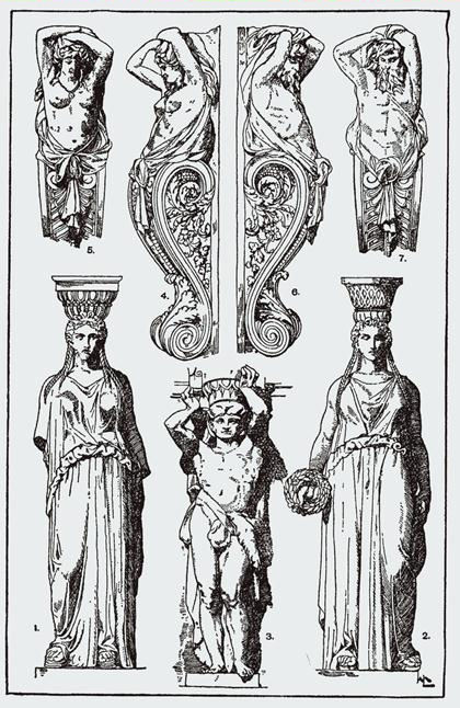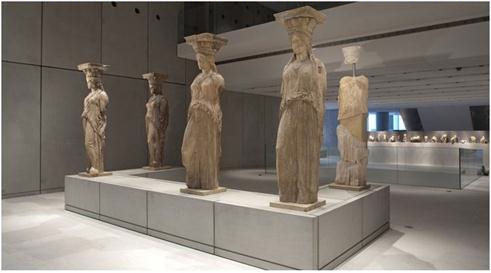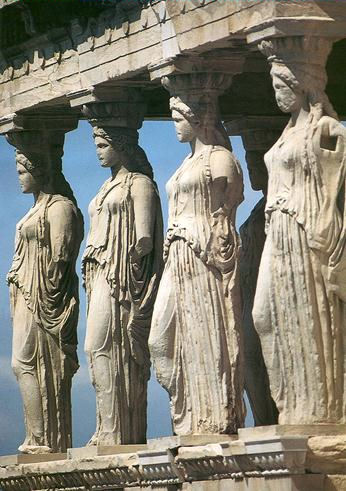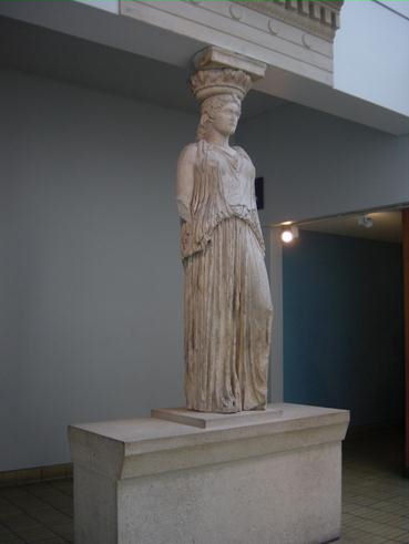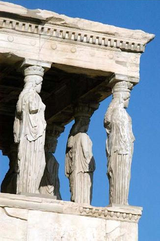 De huidige zuilen zijn kopieën. De originelen bevinden zich in het Acropolis Museum. Eén origineel bevindt zich in het British Museum. De Kariatiden zijn ontworpen voor frontaal aanzien. Het zijn zuilen. Er zijn ook zuilen bekend met mannelijk figuren. Dit noemen we Atlanten. Bij deze zuilen is gebruik gemaakt van de contrapostohouding. De zuilen zijn ook aan de achterzijde bewerkt.