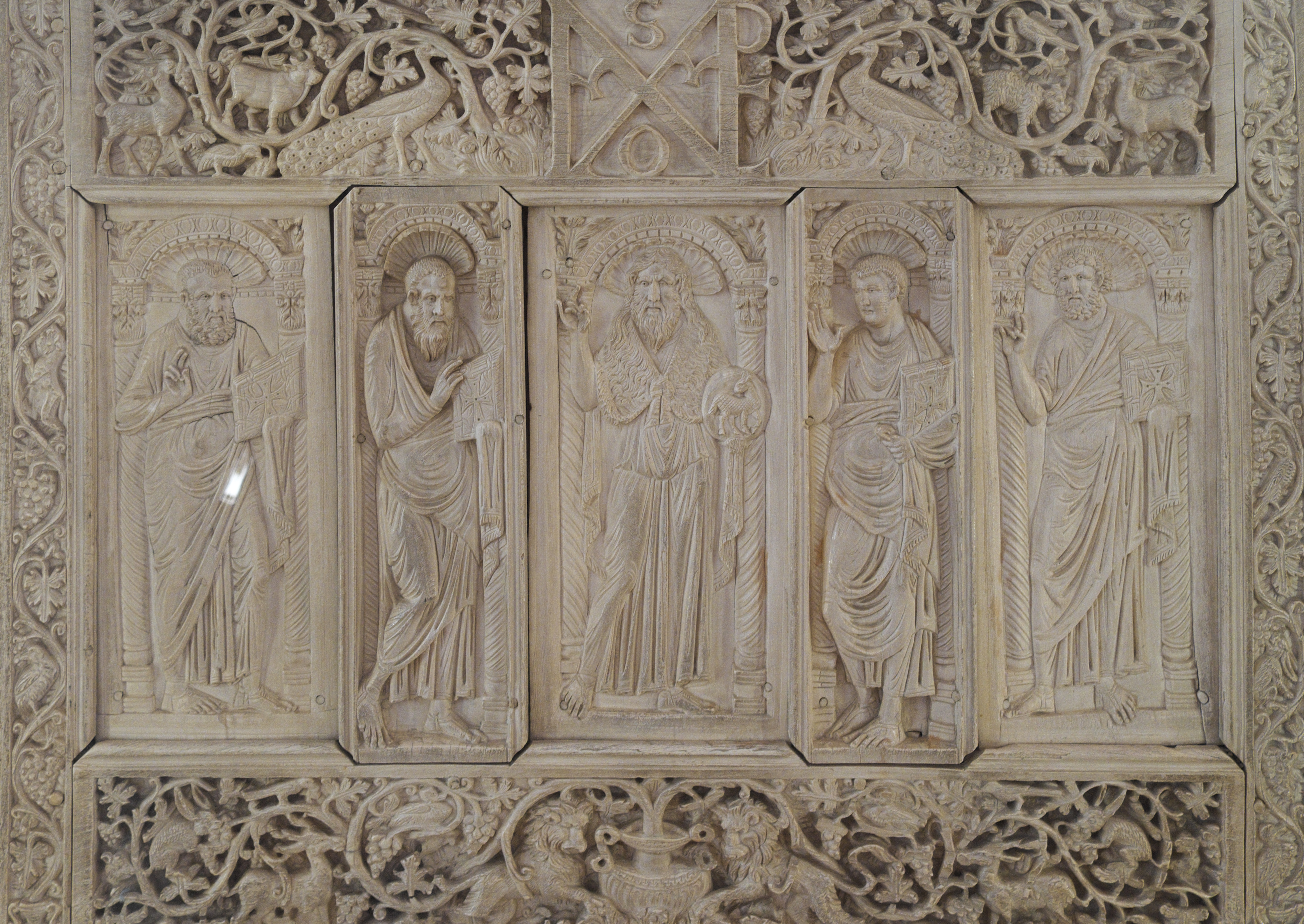 bekleed met ivoren panelen met Bijbelse voorstellingen en florale motieven.