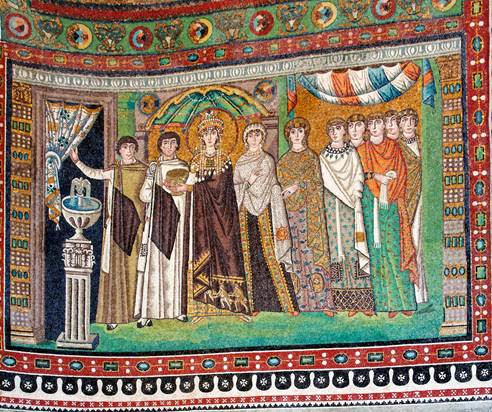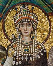 Ook keizerin Theodora is gekleed in purper. Zij draagt de