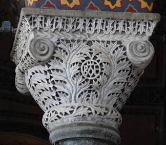 De kapitelen dateren uit de tijd van Justinianus. Dit zijn “ mandkapitelen” . Het lijkt alsof de versiering in een mandvorm is uitgehakt. De versiering is vooral in florale motieven. Opgemerkt moet worden dat alle kapitelen verschillend zijn.