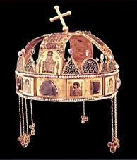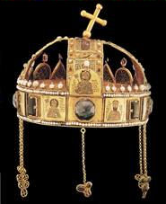De Byzantijnse kroon is vervaardigd van goud met emailtechnieken. De edelstenen zijn in het goud gevat. De hangertjes (pendulia) werden langer, naarmate de keizer beter voor zijn onderdanen zorgde of overwinningen behaalde op tegenstanders. Hoe langer de pendulia, hoe beter de keizer.