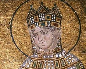 huidskleur, een baard en draagt een Byzantijnse kroon. Keizerin Irene is