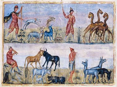 veehouder, die tokkelt op de snaren van een luit. De derde afbeelding toont een