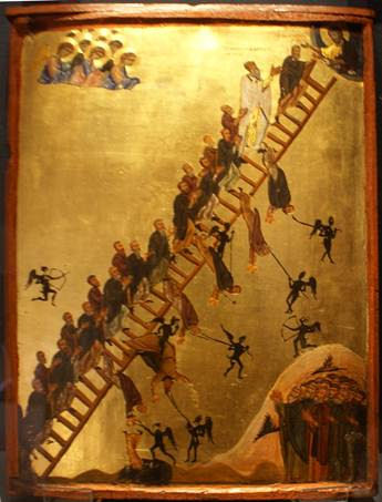 Dit ikoon beeldt uit dat de mens deugden moet bezitten om in de hemel te komen. Onderweg zijn er allerlei verleidingen. De trap symboliseert de levenswandel. Ook van de monniken. Belangrijk is dat je tegen ondeugden moet kunnen wapenen. We zien duivels ook de monniken omlaag trekken. In de rechterhoek staan een groep, die eruit zien als heilige mannen, maar die onderweg naar de hemel de verleidingen niet konden weerstaan. Zij begroeten hun gevallen broeders. Rechtsboven begroet Jezus degenen die deugdzaam hebben geleefd. De figuur die Jezus het dichts genaderd is, is Johannes Klimatos. Daarachter – in het wit – klimt de patriarch omhoog.