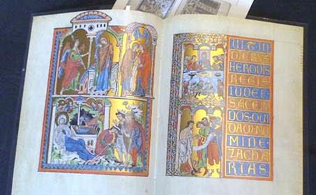 Dit is een fascimile uit het Evangelie van Goslar. We zien Gabriël Maria vertellen, dat zij de Moeder van Jezus zal worden. Daarnaast Maria en Elizabeth, de moeder van Johannes de Doper. De onderste helft is gevuld met de afbeelding van de geboorte. We zien links Maria met naast haar Jezus in de kribbe. De os en de ezel kijken toe. Rechts staan de herders en Jozef. met een rode mantel en een wat vreemde hoed. Dit is weer een kenmerk van de Europese beeldtraditie: joden werden vaak afgebeeld met vreemde hoeden.