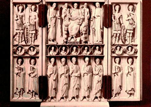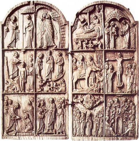 Een ivoren diptiek. Dit is een gebruiksvoorwerp geweest. Het