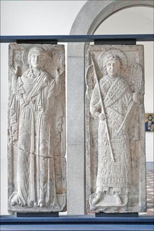 Twee keer bijna identieke afbeelding van Christus Pantocrator. De afbeelding van Christus zoals gebruikelijk in de Byzantijnse kunst. In West-Europa wordt deze vorm van afbeelden Majestas Domini genoemd, of Christus in Majesteit. De figuur van Christus heft zegend zijn rechterhand op. In de linkerarm heeft hij de Wet van Jezes. De plooival van zijn kleed heeft wel enige plasticiteit, maar slechts de suggestie van echte plooien. Dit is geen menselijke, maar een Hemelse figuur. In de Byzantijnse kunst blijft de nadruk liggen op het Hemelse, het onstoffelijke.