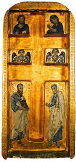 De vergulde medaillons in dit processiekruis beelden een Deësis af. Links en rechts van Christus (als Christus Pantocrator afgebeeld) staan Maria en Johannes de Doper als middelaars tussen Christus en de mensen bij het laatste oordeel.