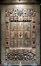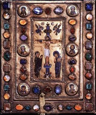 In de Tweede Gouden Eeuw ging men er toe over om het Oude en het Nieuwe Testament niet langer in boekrollen te vermenigvuldigen. In plaats daarvan werden in de scritoria veel geprepareerd kalfsleer gebruikt (perkament). Deze vellen werden samengebonden en aan de voor- en achterzijde werd een houten plankje bevestigd, als omslag. Deze houten omslag werden al gauw bedekt met goud, zilver en edelstenen. Ook werden er zoals in fig.4 miniaturen in email cloissonné op gemaakt. In fig. 4 zien we een fijne parelstructuur die het oppervlak verdeeld in rechthoeken, waarin medaillons van heiligen zijn verwerkt. In het midden op de voorzijde van deze codex staat in email cloissonné een Christus Pantocrator. Op de achterzijde staat in het midden de Maagd Maria met haar handen in de orante-houding (Virgo Orans). De rand van deze kostbare omslag is bezet met verschillende in goud gevatte edelstenen.