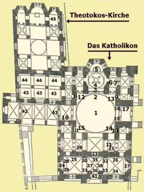 De Panagia (Theotokos) kerk heeft de vorm van een parallellogram. Het Katholikon is een Grieks kruis met een koepel.