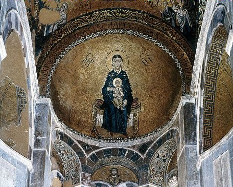 In de apsis bij het hoofdaltaar vindt men een Maria Theotokos met Christus op