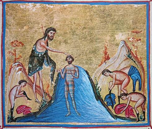 Johannes de Doper is herkenbaar aan zijn wilde voorkomen. Hij leefde als in de woestijn. Bijzonderheid aan deze illustratie is, dat Christus naakt is afgebeeld. Dit was zeer ongebruikelijk, maar er zijn drie momenten in het leven van Christus waarop het werd toegestaan om hem naakt af te beelden: de doop in de Jordaan, zijn geboorte en besnijdenis en als Christus op een steen zit geboeid om naar Golgotha te worden gevoerd.