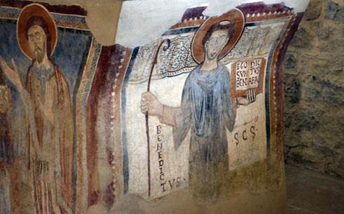 De afbeelding van Benedictus is anatomisch niet correct. Een correcte afbeelding was in de 9e -11e eeuw niet belangrijk. Het ging erom dat de beschouwer snapte wat hij zag. We zien op deze fresco een frontaal afgebeelde St.Benedictus In zijn hand heeft hij een boek met daarin zijn naam. EGO SUM BENEDICTUS ABA (Ik ben Benedictus Abt) In zijn andere hand heeft hij een bisschopsstaf. Rond zijn hoofd is een aureool afgebeeld als teken van zijn heiligheid.