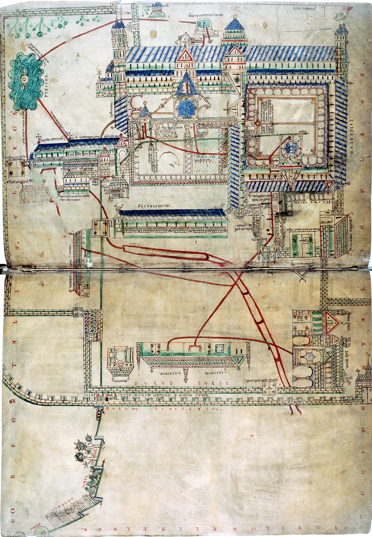 De stroomrichting van het water is aangegeven met kleuren en toont de complexiteit van het systeem: groene pijpen voeren vers water aan, oranje pijpen waren in het klooster waar de monniken leefden, rode pijpen geven het rioleringsysteem van de gezamelijke toiletten aan, gele pijpen zijn aanwijzingen voor een zinkput en bruine pijpen dienen voor de afvoer van regenwater.