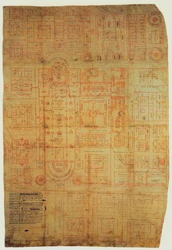 Een ander voorbeeld is de plattegrond van het benedictijner klooster van Sankt Gallen. Het origineel dateert uit ca 820 en is getekend met rode inkt.