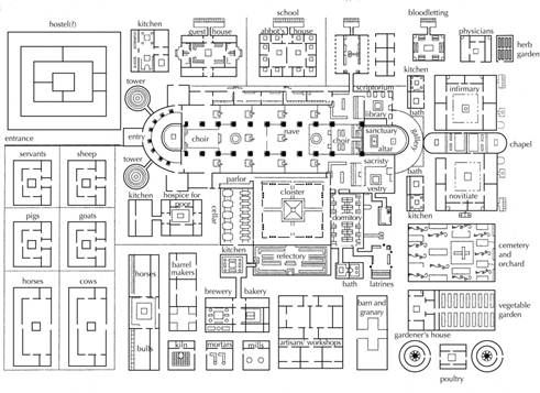 Uit deze plattegrond blijkt duidelijk dat een kloostergemeenschap rondom het kloostergebouw en de kerk een groot aantal verschillende plekken creëerde, die ieder hun eigen functie hadden. Het middelpunt is de kerk. Naast de kerk is de slaapzaal van de monniken, zodat ze bij het eerste gebed om 03.00 uur snel in de kerk zijn. Het huis van de abt ligt ook naast de kerk, maar aan de andere kant. Hieronder een moderne versie van de plattegrond met tkest in het Engels